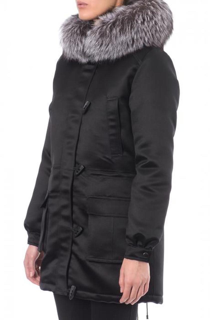 Park of coat fabrics semi-adherent silhouette fastens with drawstring at the waist and bottom of the product. Zipper strip is further covered, fastened by buttons. Elastic cuffs. Pockets, a hood with fur.