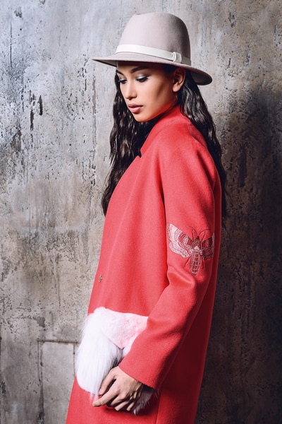 Elegant coral coat straight silhouette. Perfect cut, The single seam sleeve and stand-up collar makes it universal and suitable for any type of figure. Coat fastens with a buckle on the button. Lining made of natural viscose. Coat decorated with silk embroidery of fluttering butterflies.